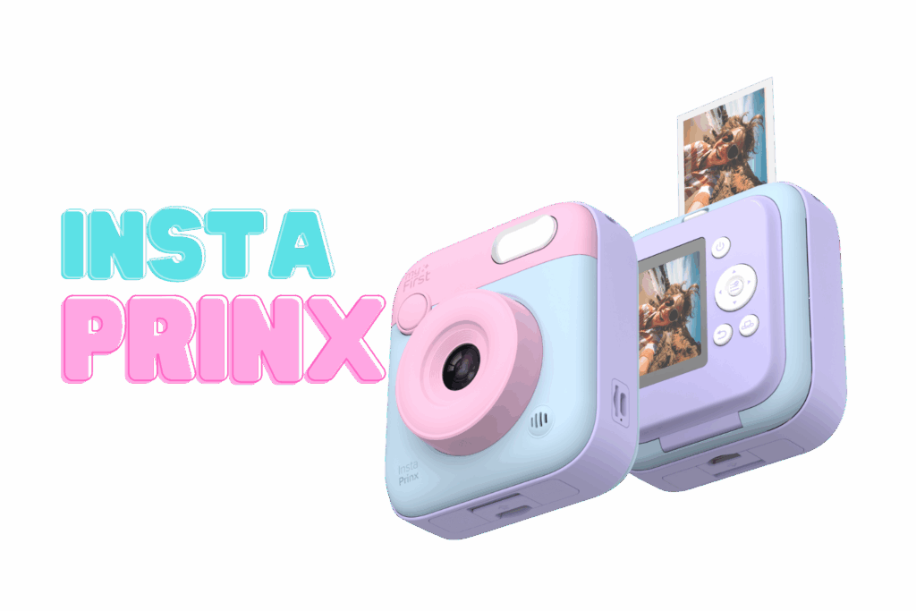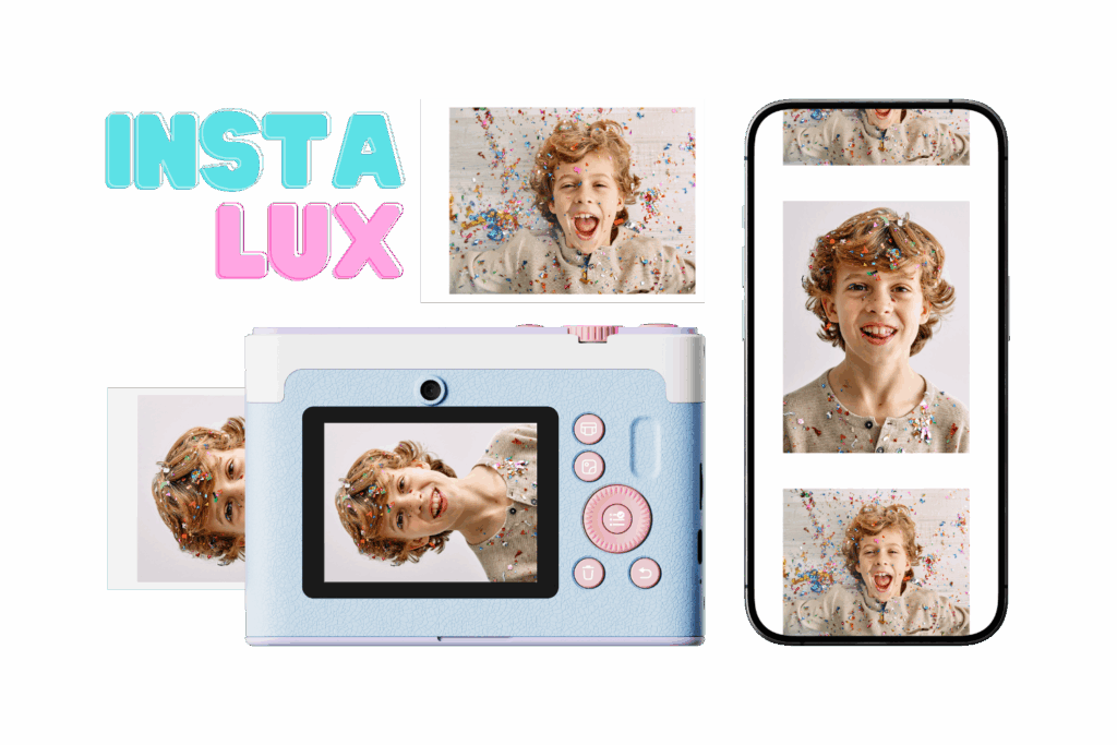 A fun, modern mini camera that prints vibrant, full-color photos instantly, connects wirelessly to your phone for easy printing, and enhances every shot with smart auto adjustments and playful effects—all in a compact, kid-friendly design built for creativity on the go.